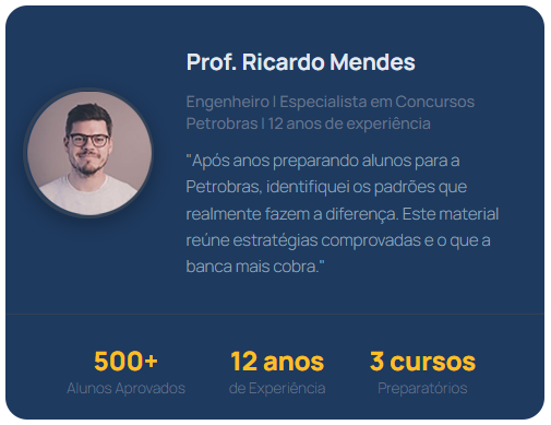Você terá acesso a todos os cadernos teóricos, organizados por disciplina, com linguagem clara, exemplos práticos e foco absoluto no padrão da banca Petrobras: